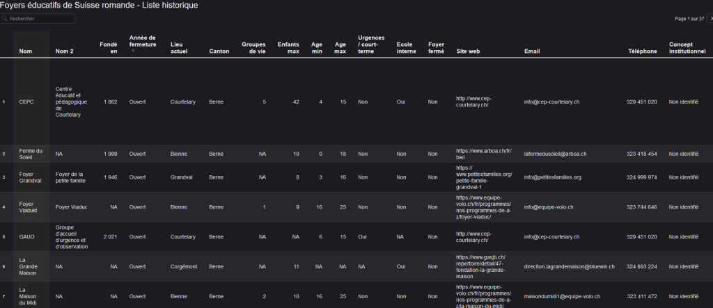 Liste et tableau comparatif des foyers de Suisse romande (en activité et fermés)