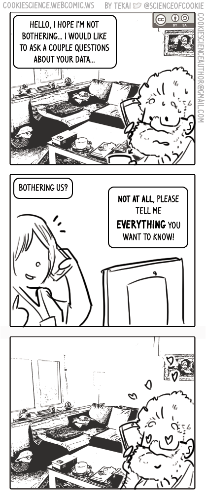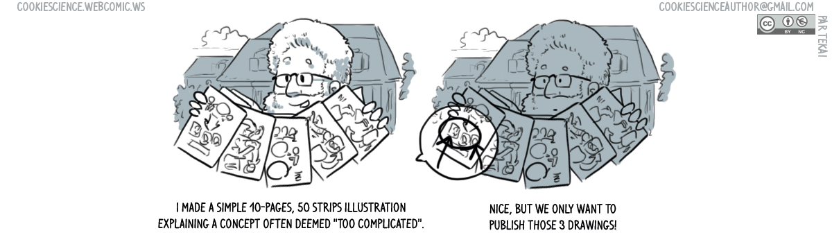 I have drawn over 1500 comic strips on the topic of scientific research. All are available from https://cookiescience.webcomic.ws/. For a sample, see: